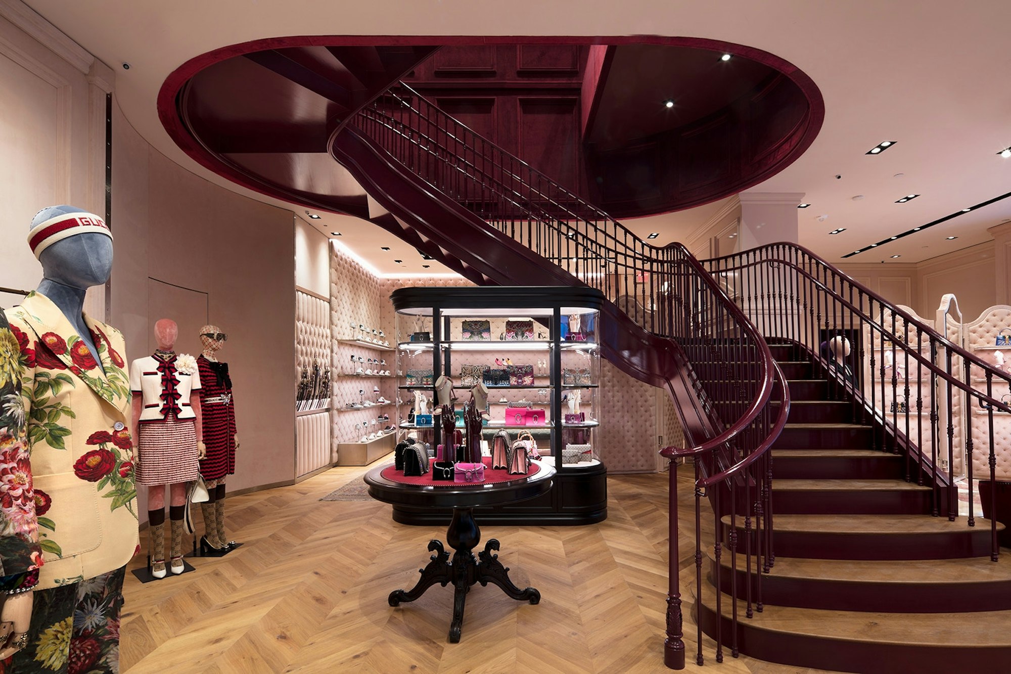 Inside is a fusion of elegance and industry. A ceiling substructure suspends the interiors. Pink fabric walls give way to a marble mosaic floor. The soft, rich fabrics of upholstered ceilings and matelassé panels gracefully contrast mechanical display units and the concrete-on-metal-deck suspending the lights. At Gucci Miami, fashion meets art, execution meets aesthetic, and architecture meets engineering.