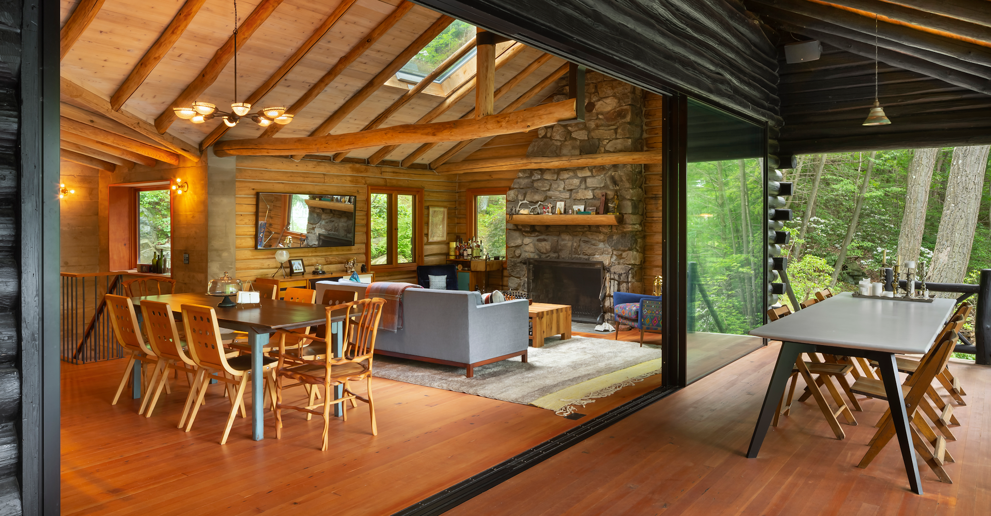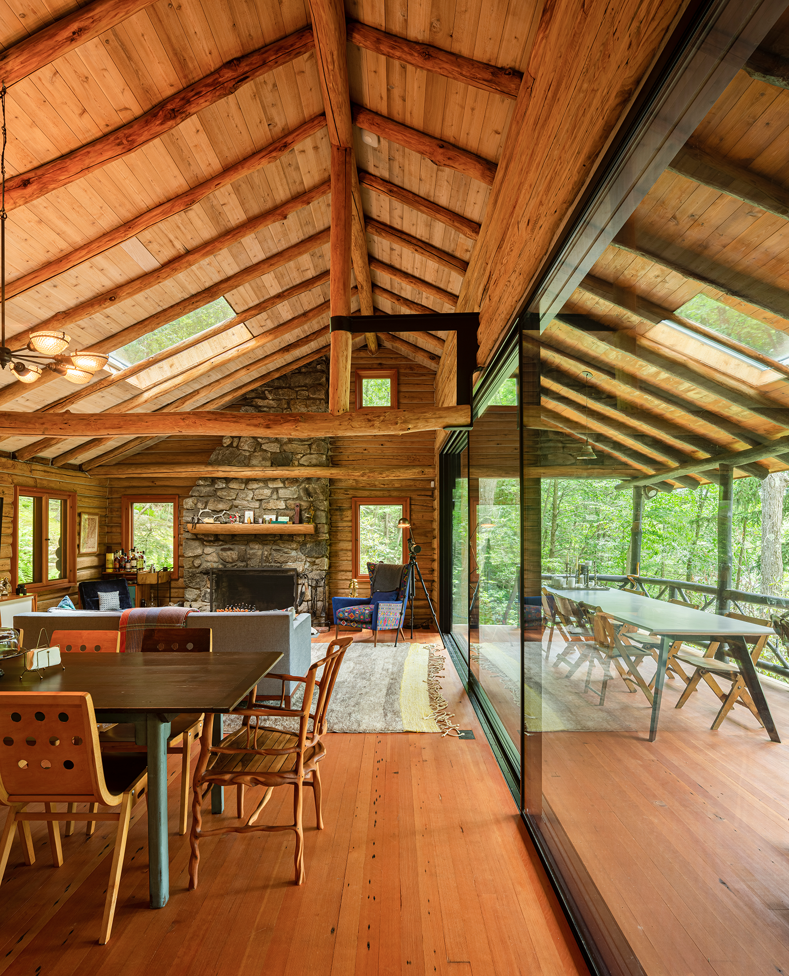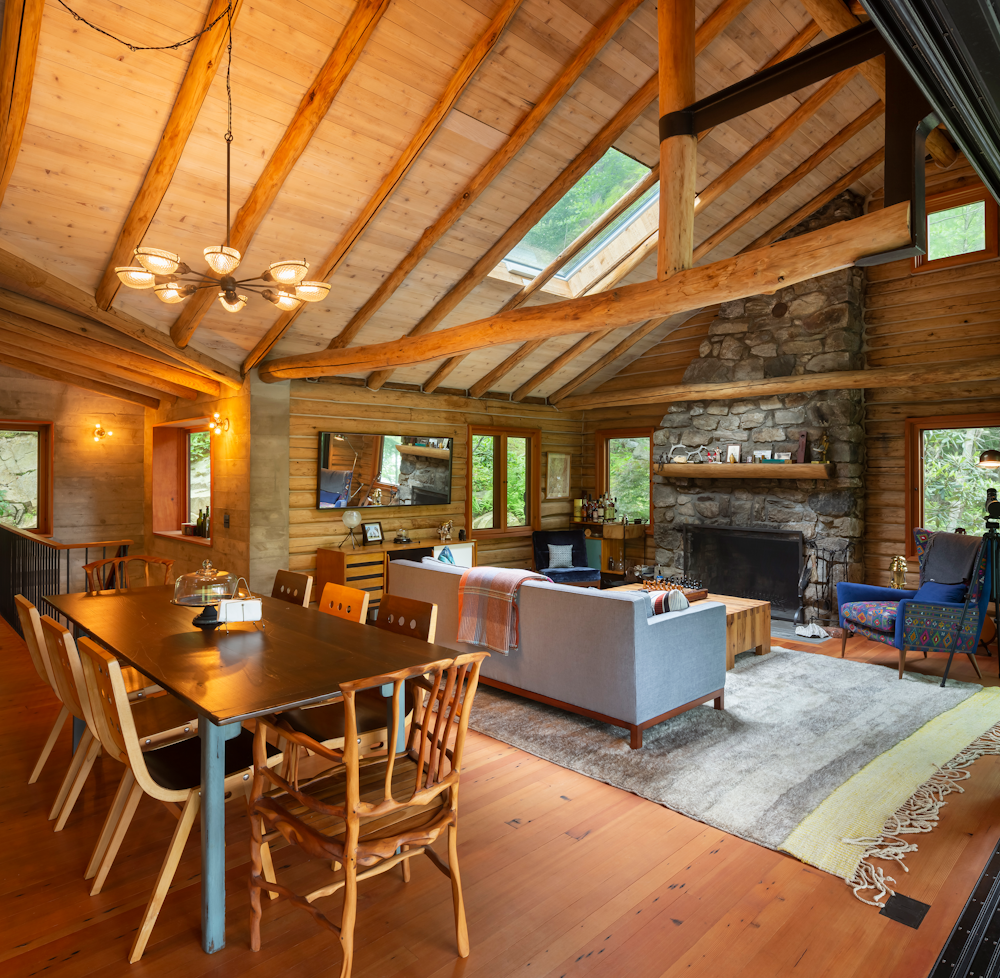 The cabin is accessed by climbing, and scrambling, down a rugged forest road. Trees and fern species flank either side. It’s situated within 1,000 acres of protected land owned by the Hudson Highlands Land Trust. Such impactful surroundings deserve a structure that connects the inside and the outside at every opportunity. Upstairs is created with petroleum-rubbed American chestnut logs from the 4-acre parcel, with a schist rubble wall foundation on the lower level.