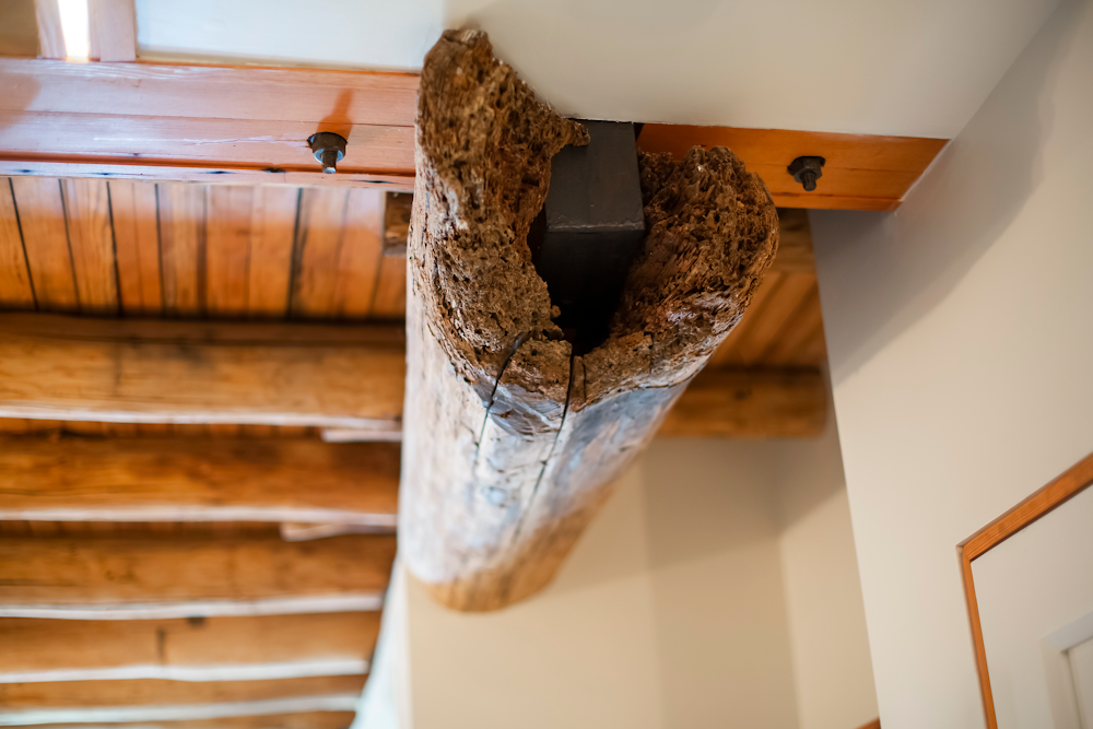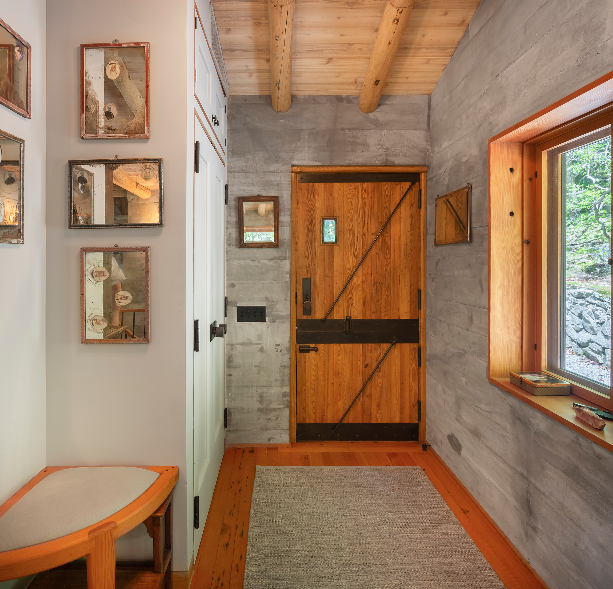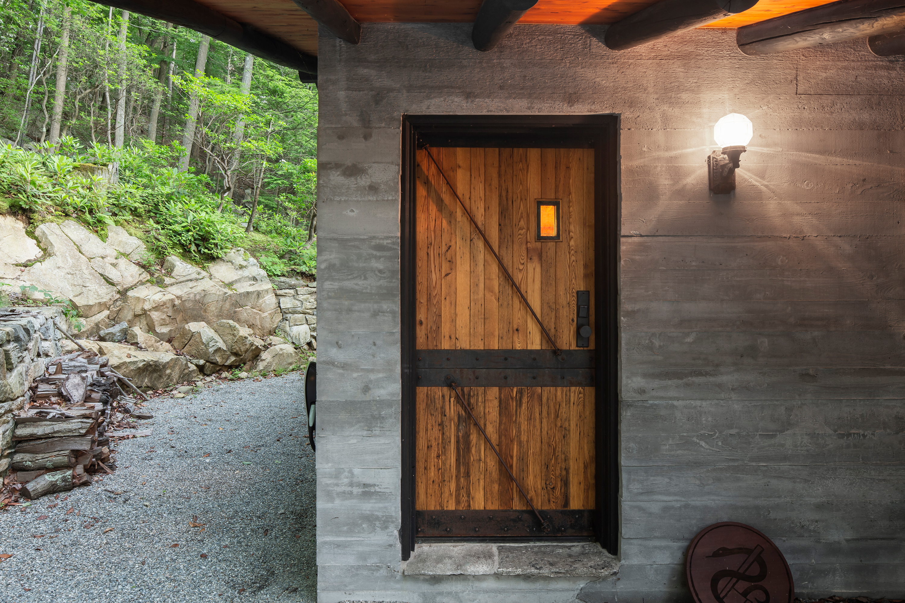 The cabin is accessed by climbing, and scrambling, down a rugged forest road. Trees and fern species flank either side. It’s situated within 1,000 acres of protected land owned by the Hudson Highlands Land Trust. Such impactful surroundings deserve a structure that connects the inside and the outside at every opportunity. Upstairs is created with petroleum-rubbed American chestnut logs from the 4-acre parcel, with a schist rubble wall foundation on the lower level.