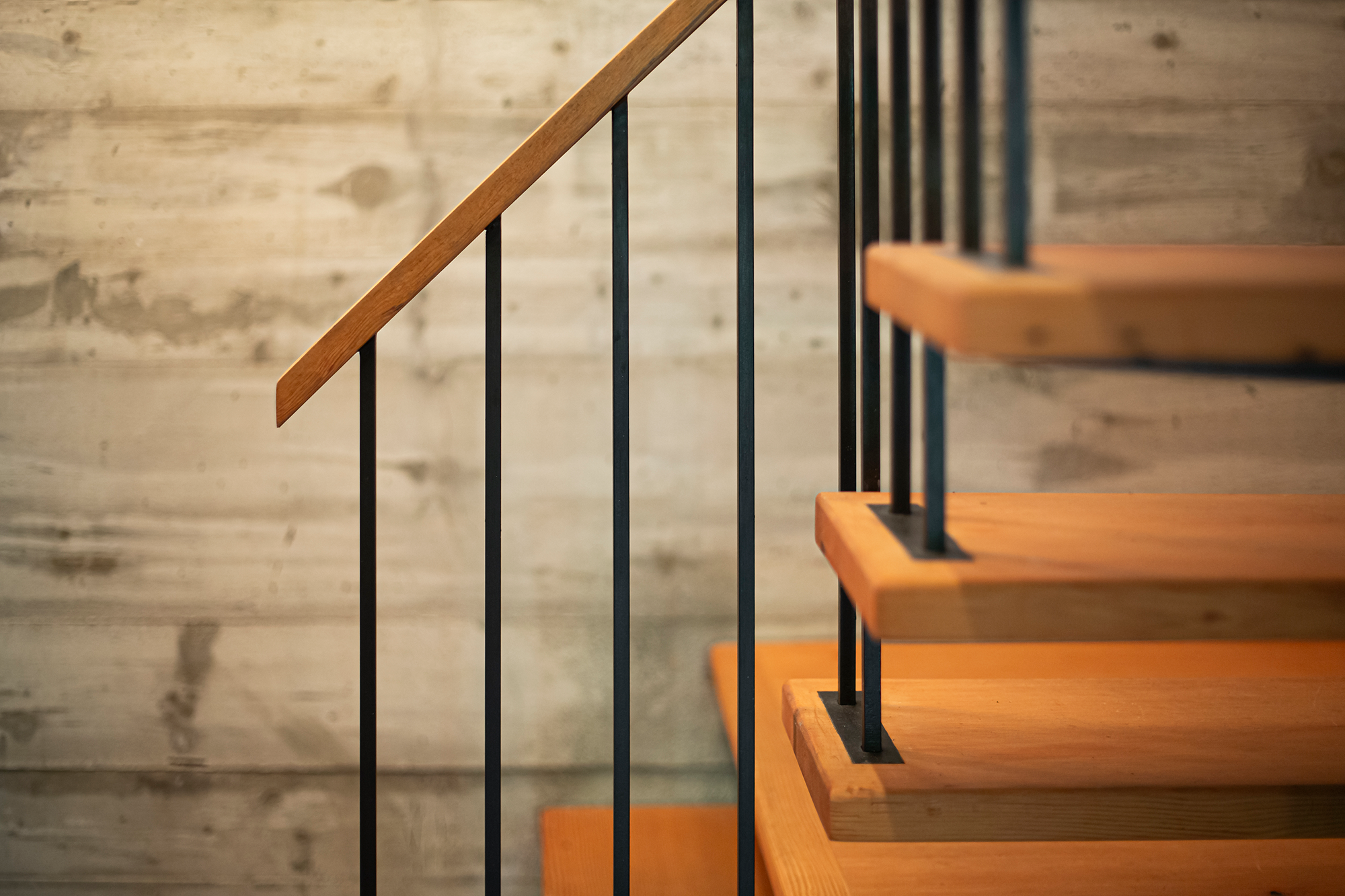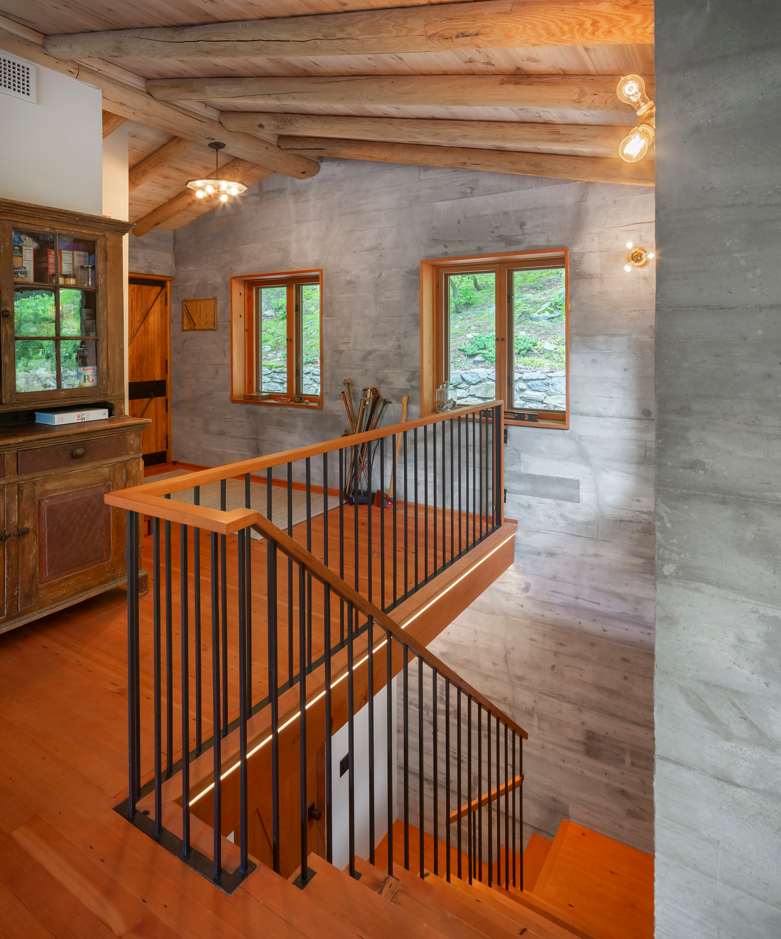 The clumsily carved out rooms on the upper floor almost feel they’ve grown with the forest. We continued this endearing sense of organic evolution, yet created a modern lakeside retreat. A wood-burning fireplace, exposed concrete walls, and steel hangars all make their place in this wonder in the woods.
