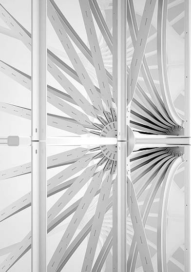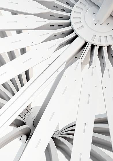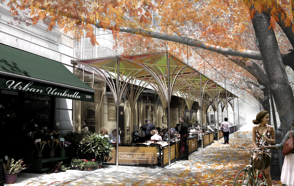 With arching struts sweeping the structure upwards, Urban Umbrella is modern and harmonious. It is gleaming white with transparent overhead panels and sustainable soft LED lighting. Not only is Urban Umbrella better looking than its predecessors, but it also allows for more air, light, and walking-around room underneath.