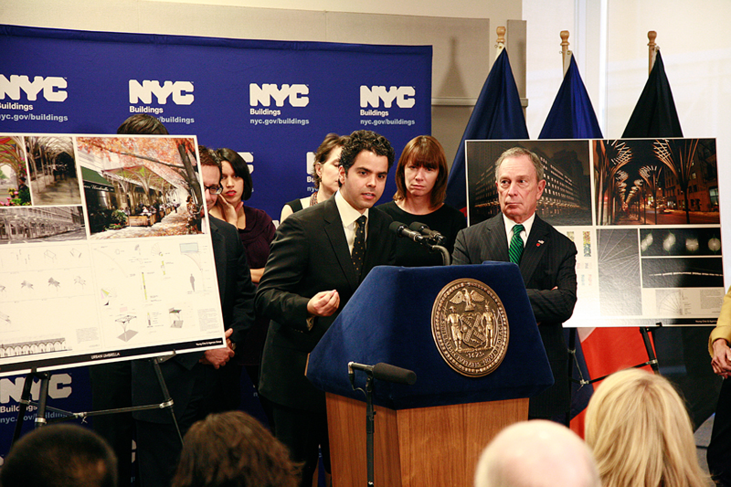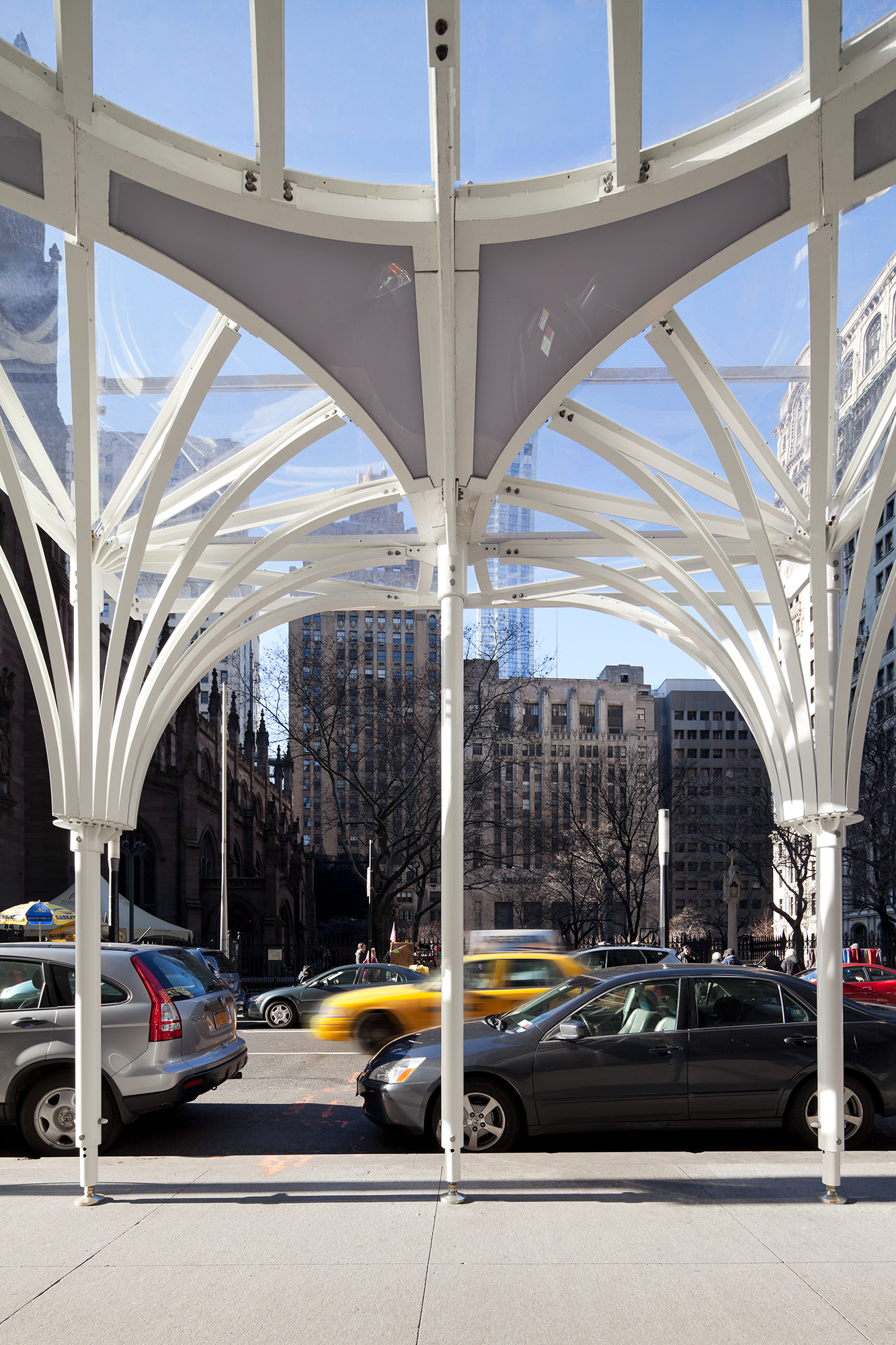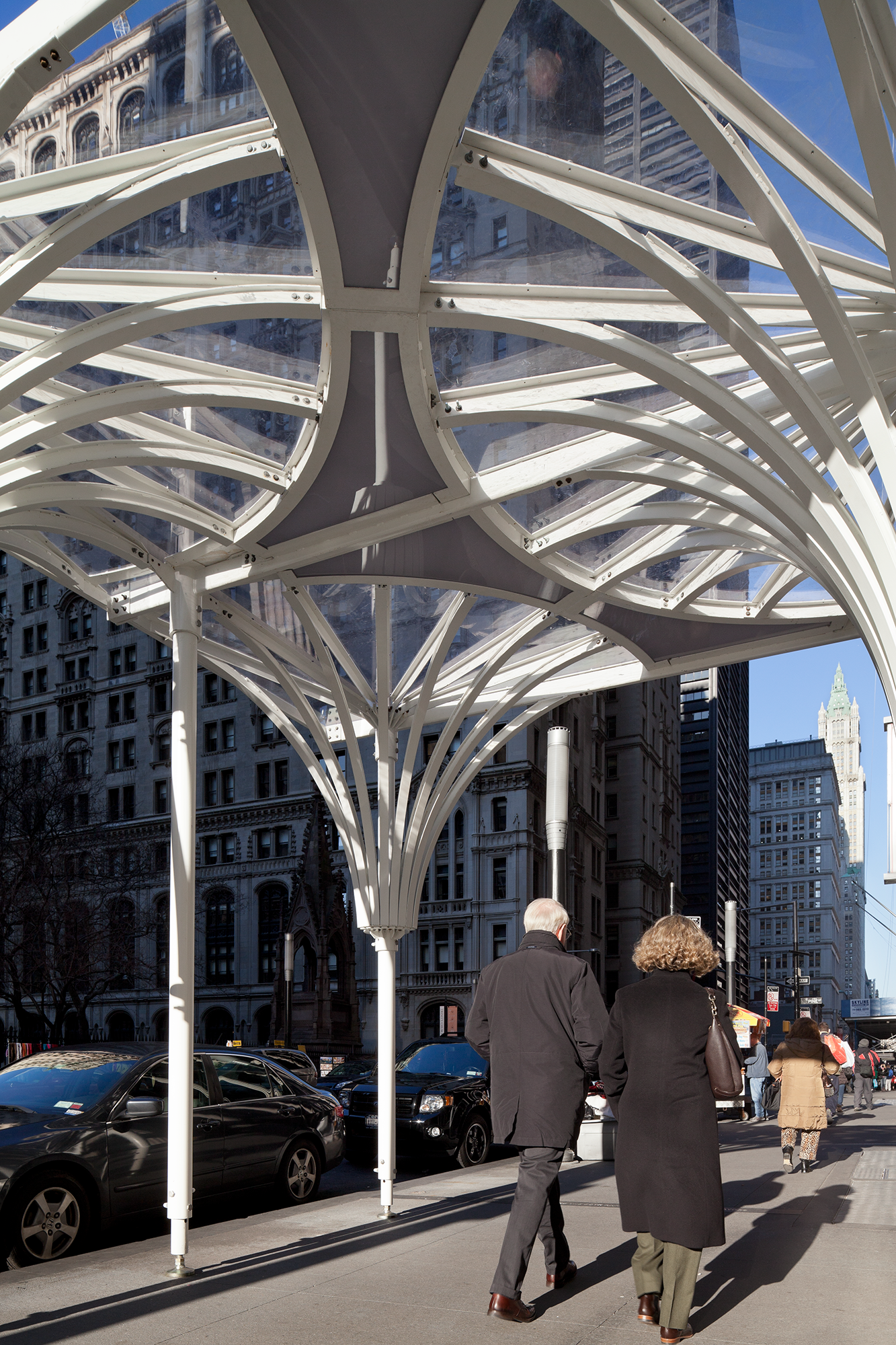 In 2009, Agencie’s design was the winning entry in a city-sponsored design competition. Run by the Department of Buildings, the competition sought a fresh new sidewalk shed to replace the dark, boxy scaffolding that is ubiquitous in New York City. Our design, called Urban Umbrella, melded high-strength steel and polycarbonate into a shape that resembles a gracefully unfurling umbrella.